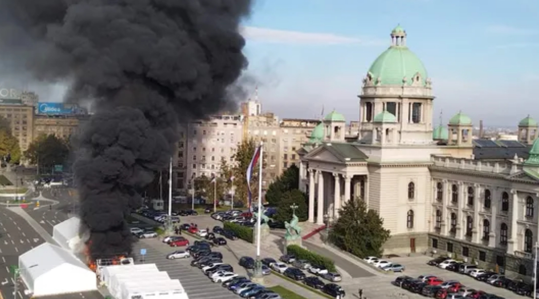 Beograd, 22. oktobar 2025. — Na platou ispred Skupštine Srbije, gdje su postavljeni šatori učesnika protesta, jutros je izbio požar u jednom od objekata poznatih kao „Ćacilend“. Gust crni dim uznemirio je prolaznike, a vatrogasne ekipe su brzo stigle na lice mjesta.
